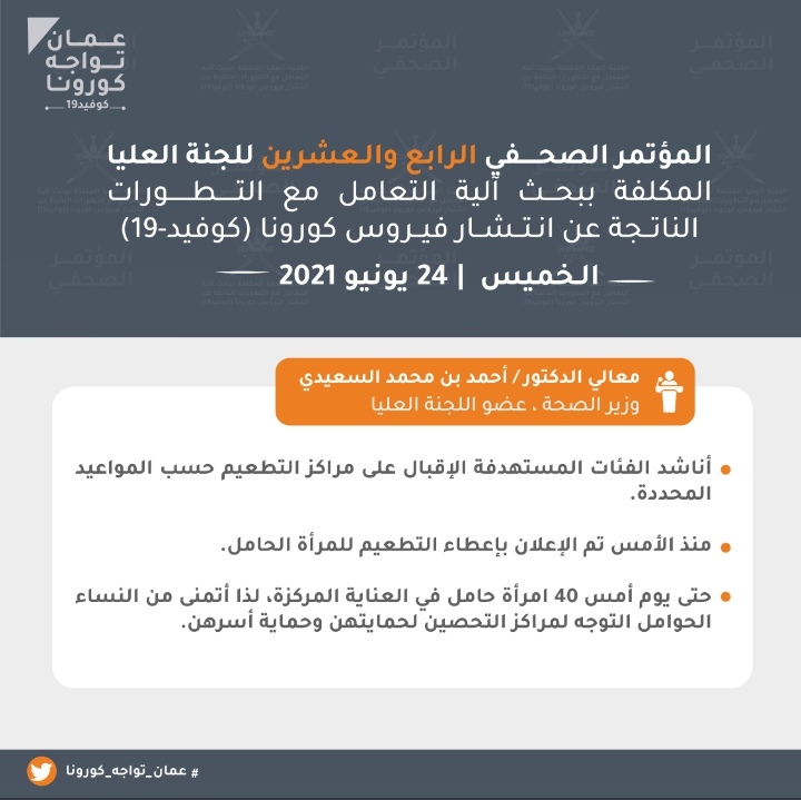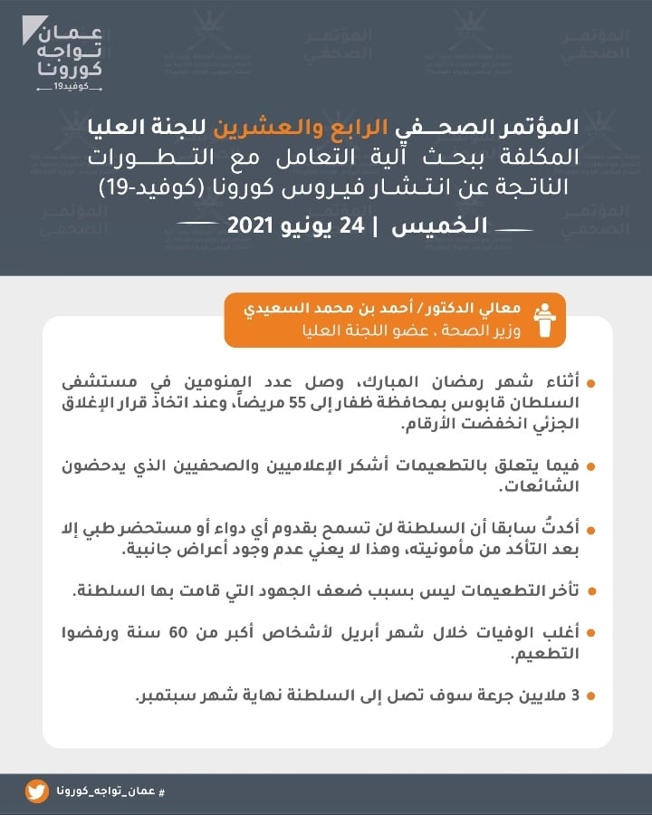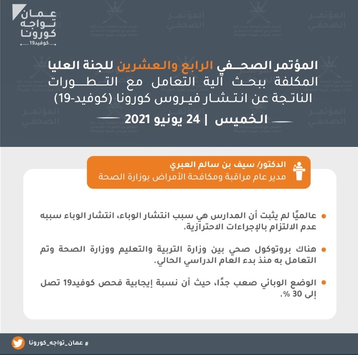 عقدت اليوم الخميس اللجنة العليا المكلفة ببحث آلية التعامل مع التطورات الناتجة عن انتشار فيروس كورونا كوفيد 19 المؤتمر الصحفي التاسع عشر بمشاركة كلٍّ من : معالي الدكتور/ أحمد بن محمد السعيدي- وزير الصحة، سعادة/ سالم بن محمد النعيمي- وكيل وزارة النقل و الاتصالات و تقنية المعلومات للنقل المكلف بأعمال هيئة الطيران المدني، العميد/ محمد بن ناصر الكندي- مدير عام العمليات بشرطة عمان السلطانية، الفاضل/ مبارك بن محمد الدوحاني- مدير عام التجارة بوزارة التجارة و الصناعة و ترويج الاستثمار، الدكتور/ سيف بن سالم العبري- مدير عام مراقبة و مكافحة الأمراض بوزارة الصحة، الدكتورة/ ثمرة بنت سعيد الغافرية- المكلفة بأعمال المدير العام للخدمات الصحية لمحافظة مسقط، و الفاضل/ بدر بن سيف الراوحي- مدير مكافحة الأمراض المعدية بوزارة الصحة، وجاء في المؤتمر :
