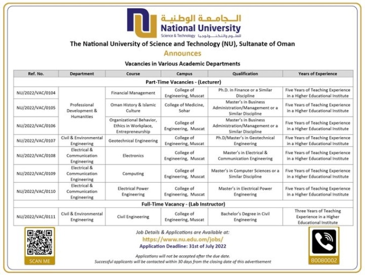 أعلنت الجامعة الوطنية للعلوم و التكنولوجيا عن رغبتها بتعيين لديها :