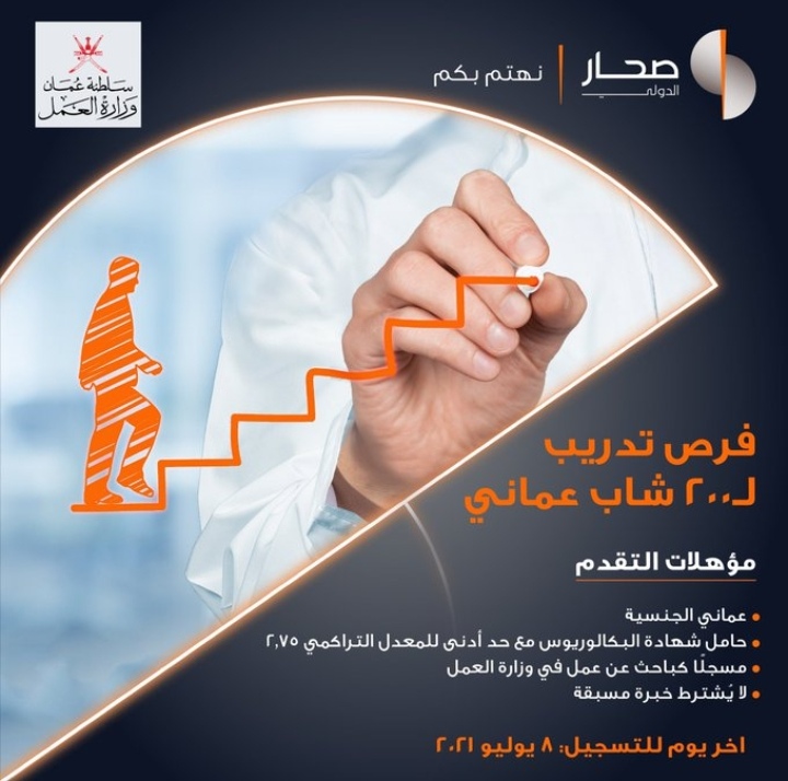 أعلن بنك صحار الدولي عن بدء التسجيل ل٢٠٠ فرصة تدريب للشباب العماني بالتعاون مع وزارة العمل، حيث سيتم تدريب وتطوير الكفاءات الوطنية من خلال برنامج تدريبي يمتد لمدة عامين في عدد من المؤسسات من قطاعات مختلفة.