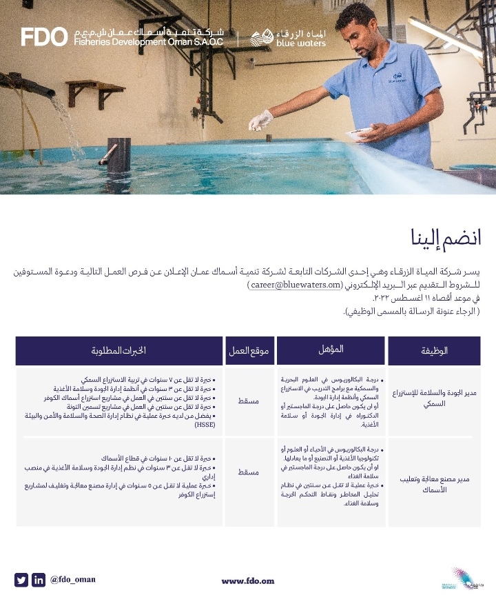 أعلنت شركة المياه الزرقاء عن رغبتها بتعيين لديها