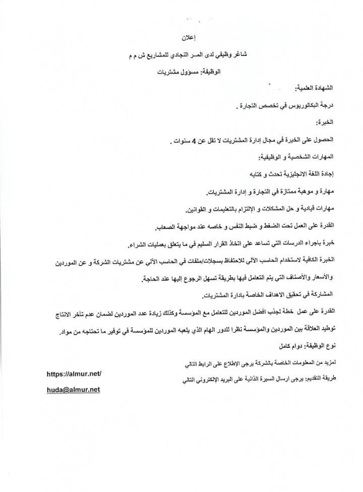 أعلنت شركه المر النجادي للمشاريع عن رغبتها بتعيين لديها :