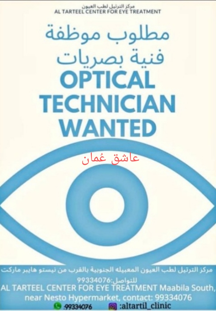 أعلن مركز الترتيل لطب العيون عن رغبتها بتعيين لديها موظفة فنية بصريات. للتواصل : 99334076 لتصفح المزيد من جديد الوظائف و التدريب بالسلطنة اضغط هنا