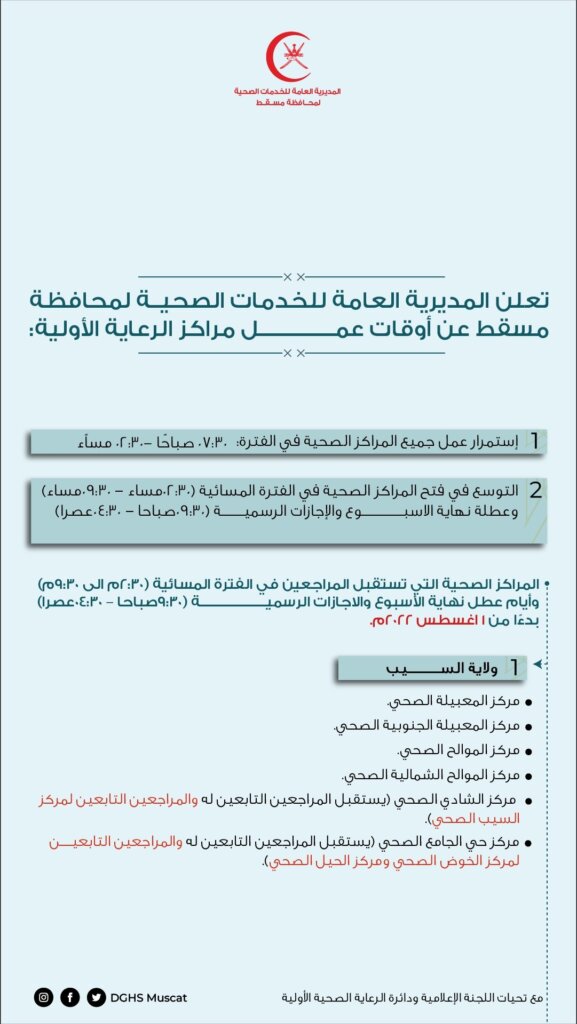 أعلنت “صحية محافظة مسقط” عن أوقات عمل مراكز الرعاية الأولية لمحافظة مسقط ابتداءً من شهر أغسطس 2022 م .