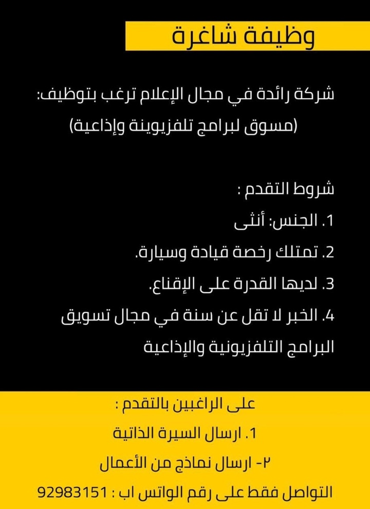 أعلنت شركة في مجال الإعلام عن رغبتها بتعيين لديها مسوق لبرامج تلفزيونية و إذاعية.