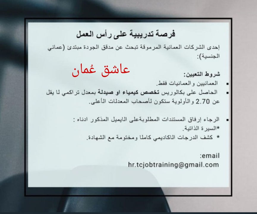 أعلنت شركة عمانية في مجال الأغذية عن توفر فرصة تدريبية على رأس العمل مقرونة بالتوظيف وذلك لخريجي بكالوريوس الكيمياء أو الصيدلة للعمل كمدقق جودة.