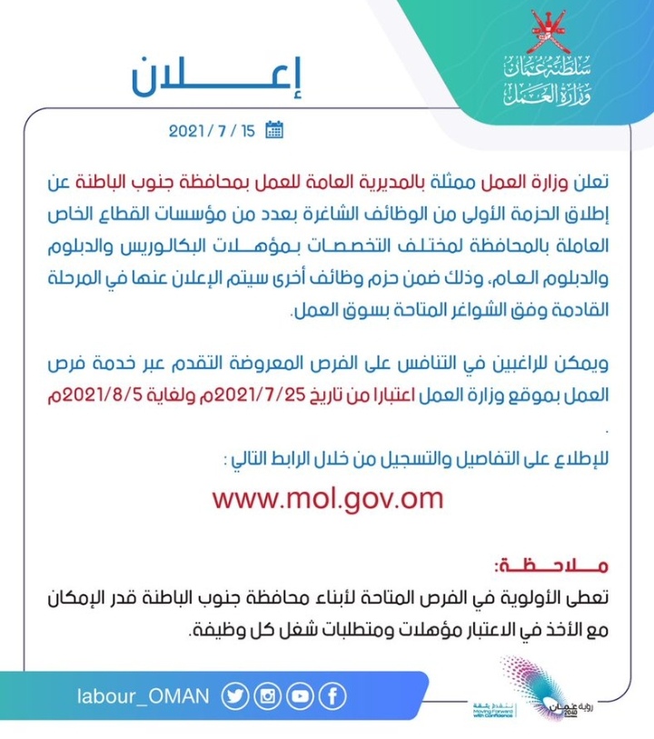 أعلنت وزارة العمل ممثلة بالمديرية العامة للعمل بمحافظة جنوب الباطنة عن إطلاق الحزمة الأولى من الوظائف الشاغرة بعدد من مؤسسات القطاع الخاص العاملة بالمحافظة لمختلف التخصصات . للتقديم اضغط هنا لتصفح المزيد من جديد الوظائف و التدريب بالسلطنة اضغط هنا