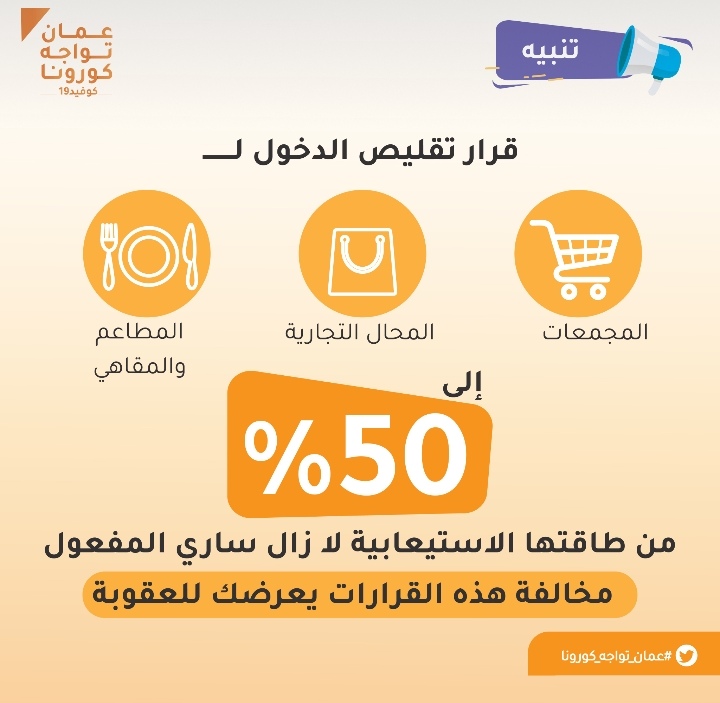 تنبيه حول تقليص الدخول للمجمعات والمحال التجارية والمطاعم والمقاهي إلى 50% من طاقتها الاستيعابية لا زال ساري المفعول.لى 50٪ من طاقتها الاستيعابية لا زال ساري المفعول.