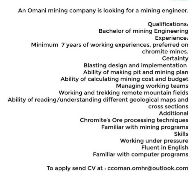 شركة تعدين عمانية تبحث عن مهندس تعدين مع خبرة 7 سنوات. للتواصل وارسال السيرة الذاتية : ccoman.omhr@outlook.com اضغط هنا