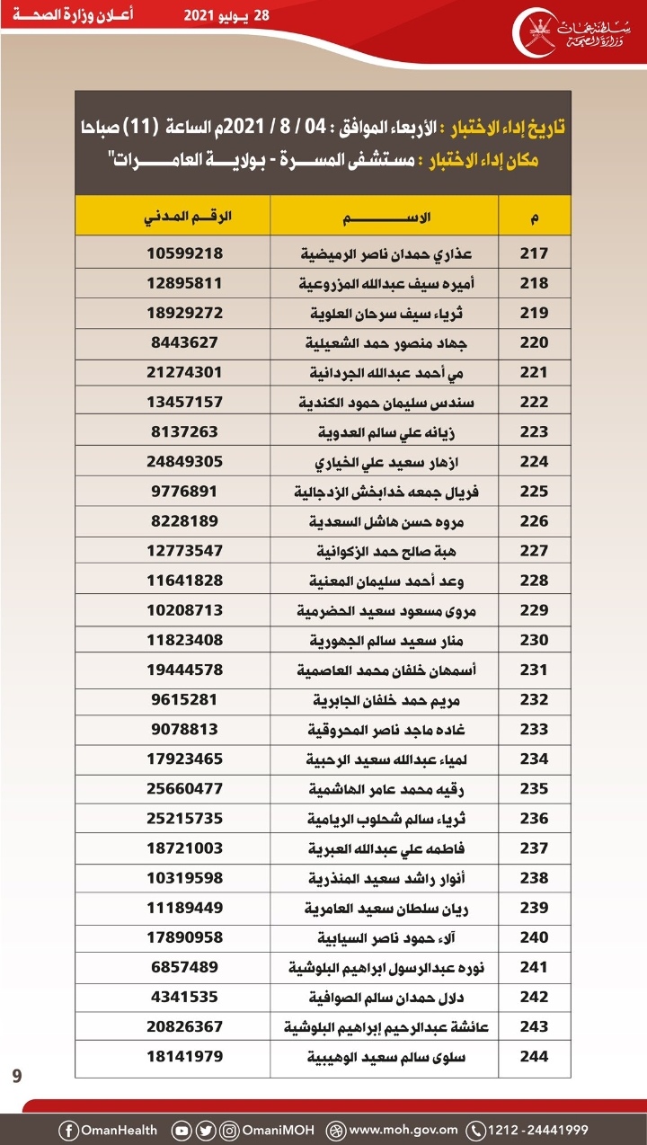 أعلنت وزارة الصحة بالتنسيق مع وزارة العمل للمواطنين المبينة أسماؤهم أدناه والذين سبق لهم ان تقدموا بطلباتهم لشغل وظيفة ( مهندس معدات طبية )بأن عليهم الحضور لإجراء الاختبار التحريري في المكان والزمان الموضحين مصطحبين معهم أصل وصورة من البطاقة الشخصية أو الجواز السفر.