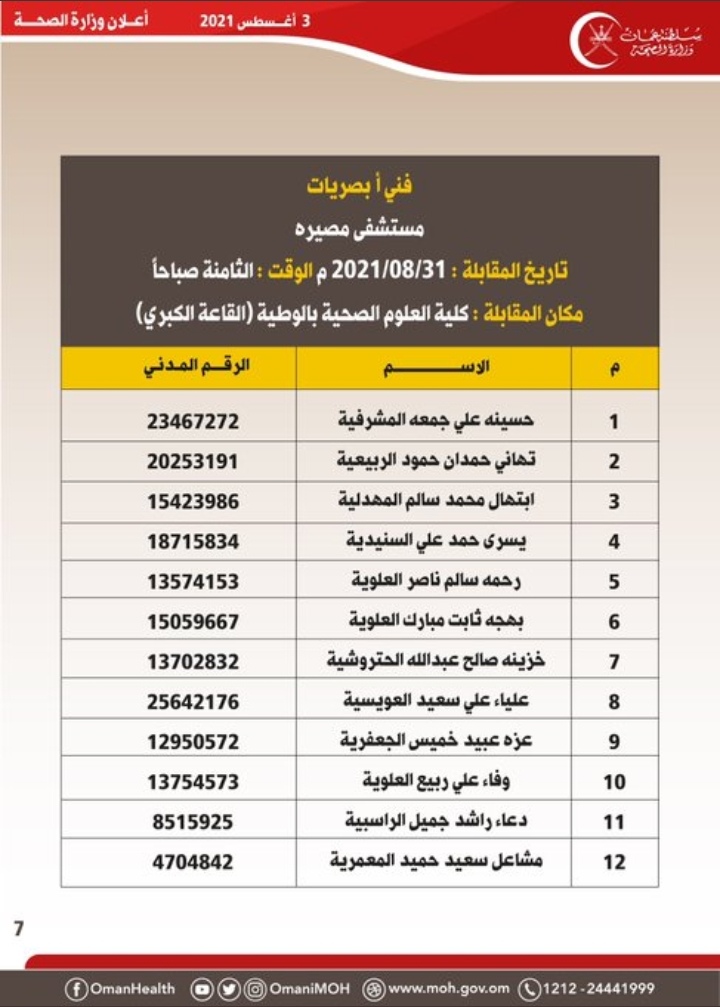 أعلنت وزارة الصحة بالتنسيق مع وزارة العمل للمواطنين المبينة أسماؤهم أدناه والذين سبق لهم التقدم لشغل إحدى الوظائف الطبية والطبية المساعدة بأن عليهم الحضور في الزمان والمكان المحددين بالإعلان لحضور الإختبار التحريري والمقابلة الشخصية.