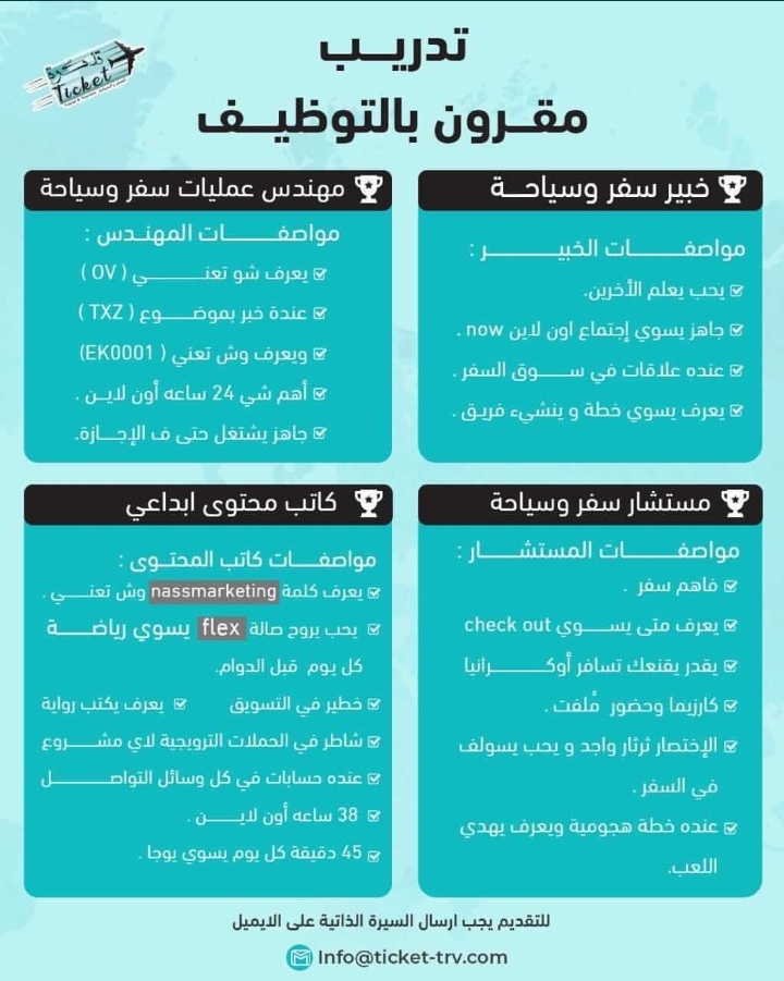 أعلنت شركة تذكرة للسفر والسياحة عن توفر فرص تدريب مقرونة بالتوظيف للفرص التالية: