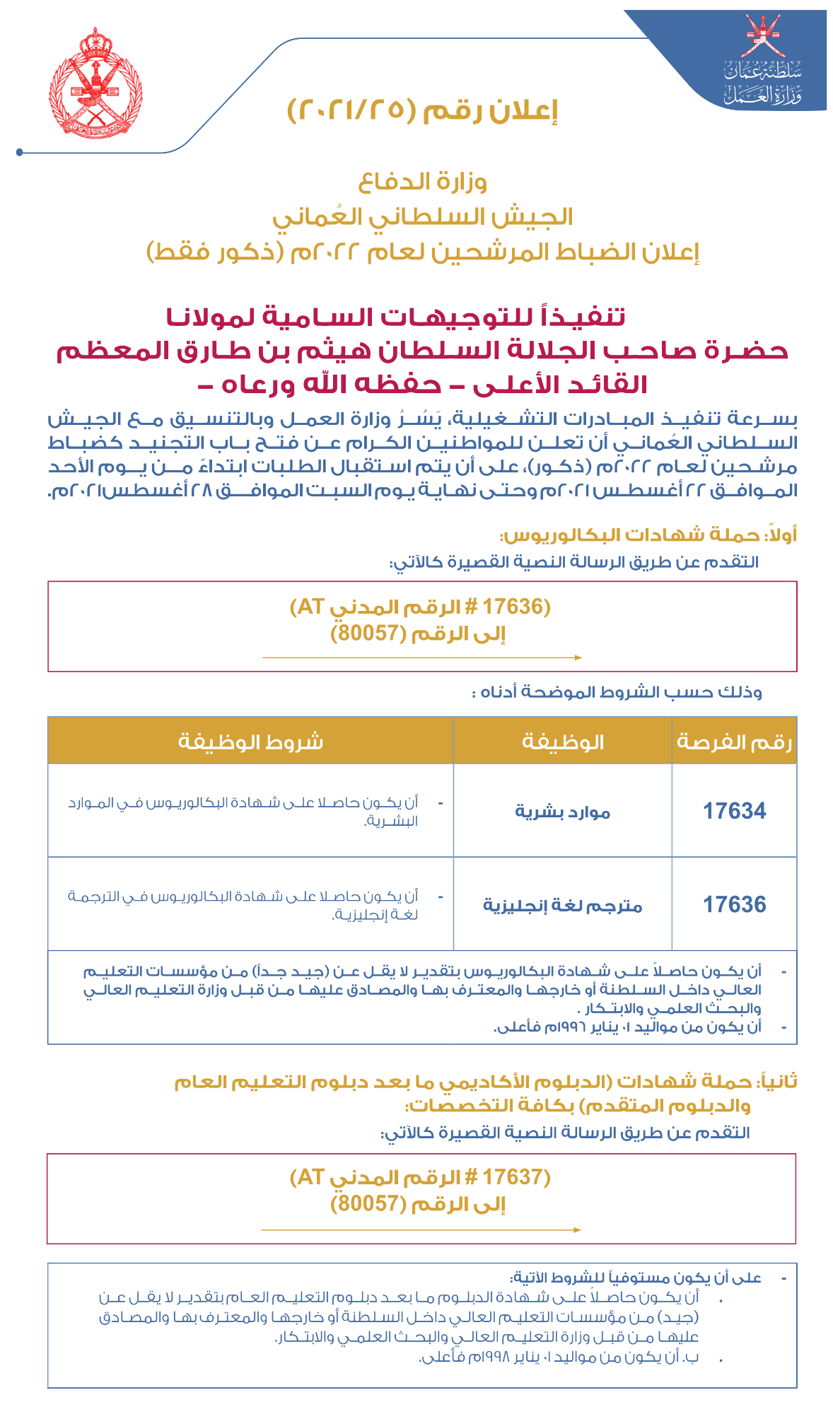 ُ السلطاني العماني أن تعلن للمواطنيــن الكرام عــن فتــح باب التجنيد كضباط مرشـحين لعـام ٢٠٢٢ ً م )ذكـور (، على أن يتم اسـتقبال الطلبات ابتداء مـــن يـــوم الأحد المــوافــق 22 أغسطـس 2021م وحتـى نهـايـة يـوم السبـت الموافــــق 28 أغسطس2021م.