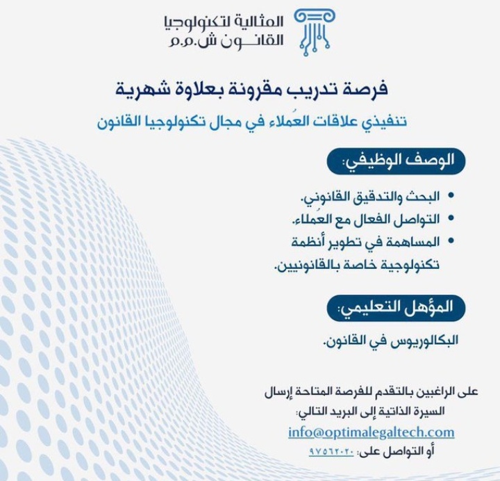 أعلنت الشركة المثالية لتكنولوجيا القانون عن توفر فرص تدريبية كتنفيذي علاقات العملاء في مجال تكنولوجيا القانون .