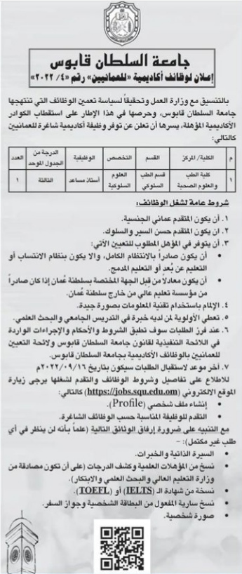 أعلنت جامعة السلطان قابوس عن رغبتها بتعيين لديها :
