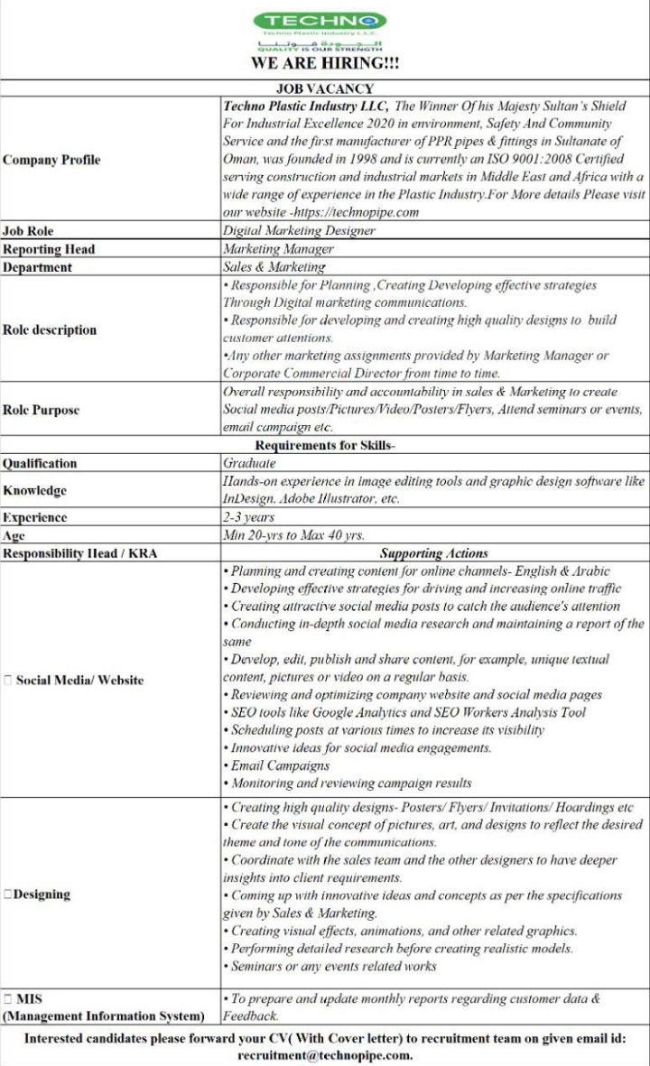 أعلنت شركة صناعة تقنية البلاستيك عن رغبتها بتعيين لديها مصمم جرافيك.
