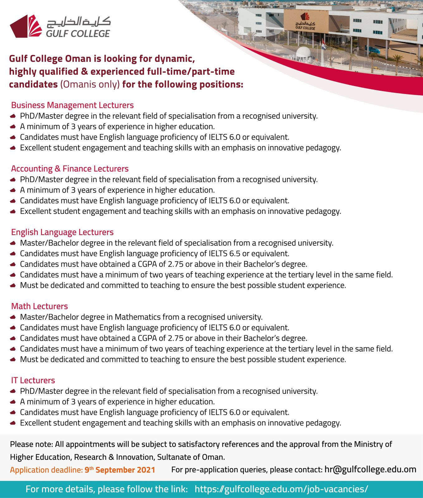 أعلنت كلية الخليج عن توفر شواغر وظيفية للمحاضرين للاطلاع على التفاصيل والتسجيل اضغط هنا ، علما أن آخر موعد للتسجيل هو الخميس ٩ سبتمبر ٢٠٢١م