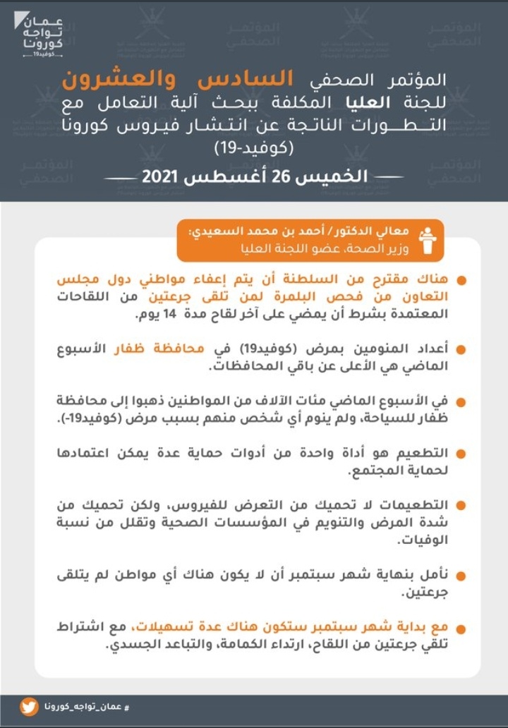 عقدت اليوم الخميس اللجنة العليا المكلفة ببحث آلية التعامل مع التطورات الناتجة عن انتشار فيروس كورونا كوفيد 19 المؤتمر الصحفي السادس و العشرون بمشاركة كلٍّ من : معالي الدكتور/ أحمد بن محمد السعيدي- وزير الصحة، معالي الدكتورة/ مديحة بنت أحمد الشيبانية – وزيرة التربية و التعليم، سعادة الدكتور/ محمد بن سعيد المعمري – وكيل وزارة الأوقاف و الشؤون الدينية، اللواء/ عبدالله بن علي الحارثي – مساعد المفتش العام للشرطة و الجمارك للعمليات، سعادة المهندس/ نايف بن علي بن حمد العبري – رئيس هيئة الطيران المدني، الدكتور/ سيف بن سالم العبري – مدير عام مراقبة و مكافحة الأمراض بوزارة الصحة، و الدكتور/ يحيى بن خميس الحارثي – مدير عام تطوير مناهج بوزارة التربية و التعليم وجاء في المؤتمر :