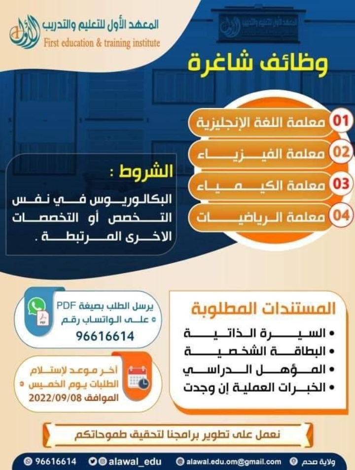 أعلن المعهد الأول للتعليم والتدريب عن رغبته بتعيين لديه :