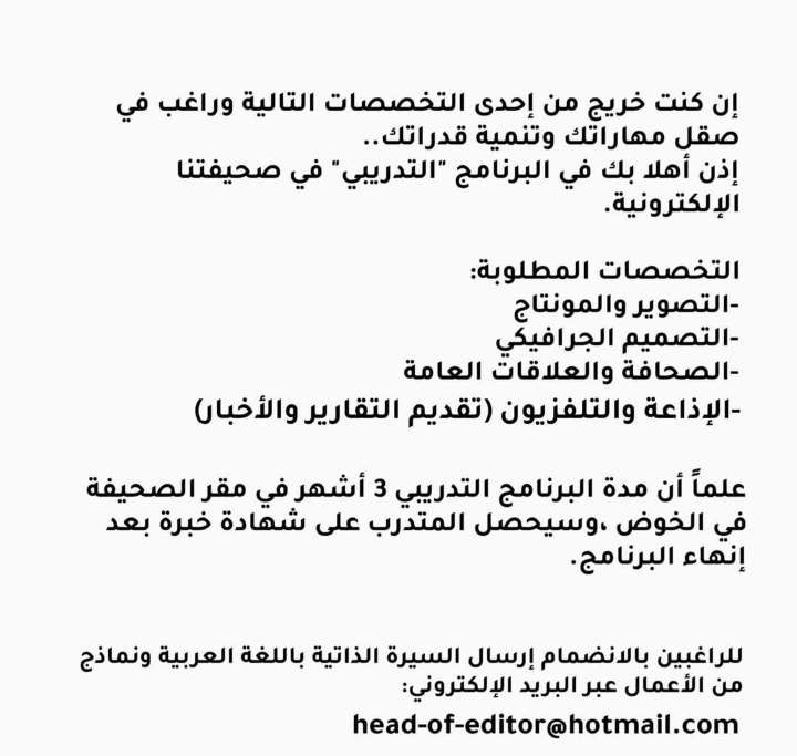 أعلنت صحيفة الصحوة الإلكترونية عن برنامج تدريبي في التخصصات التالية :