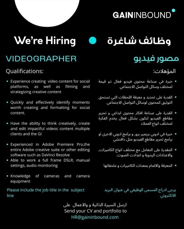 وكالة تسويق عن رغبتها بتعيين لديها مصور فيديو بالشروط التالية :