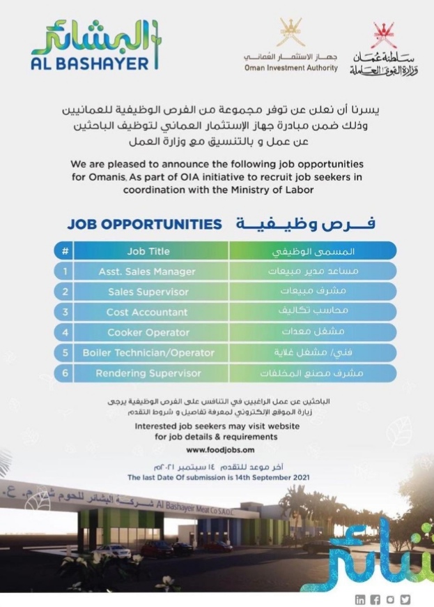 ضمن مبادرة جهاز الاستثمار العماني لتوظيف الباحثين عن عمل وبالتنسيق مع وزارة العمل اعلنت شركة البشائر للحوم عن توفر شواغر وظيفية لديها بمسمى :