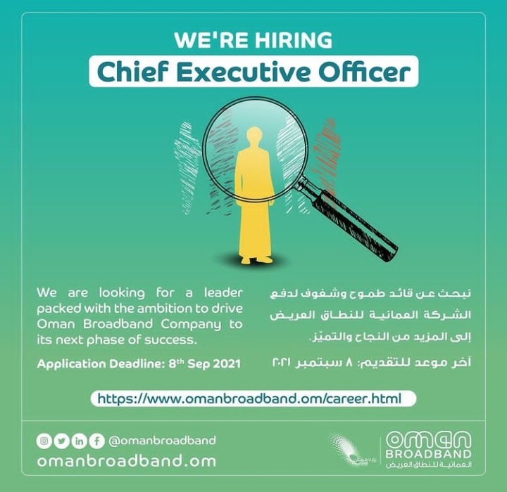 أعلنت الشركة العمانية للنطاق العريض عن رغبتها بتعيين لديها رئيس تنفيذي مع خبرة 17 سنة. للتقديم اضغط هنا لتصفح المزيد من جديد الوظائف و التدريب بالسلطنة اضغط هنا