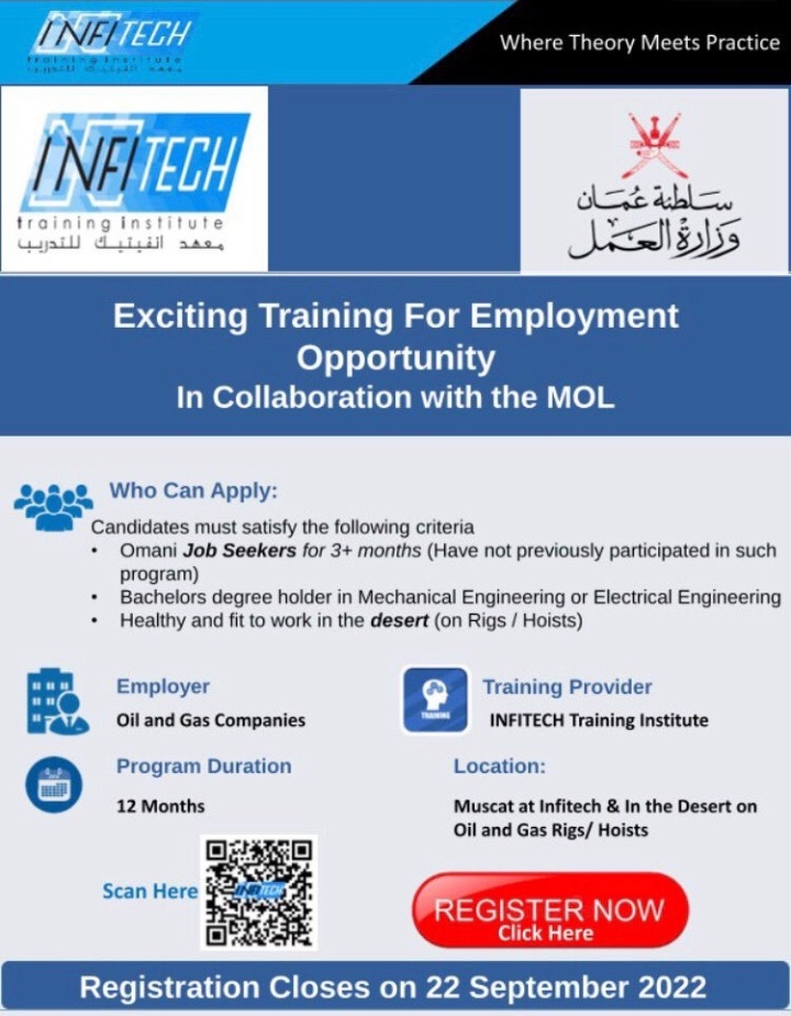 فرص تدريب على رأس العمل مقرونة بالتشغيل في منشئات النفط والغاز بالتعاون مع وزارة العمل ،وذلك لخريجي بكالوريوس الهندسة الميكانيكية والهندسة الكهربائية.