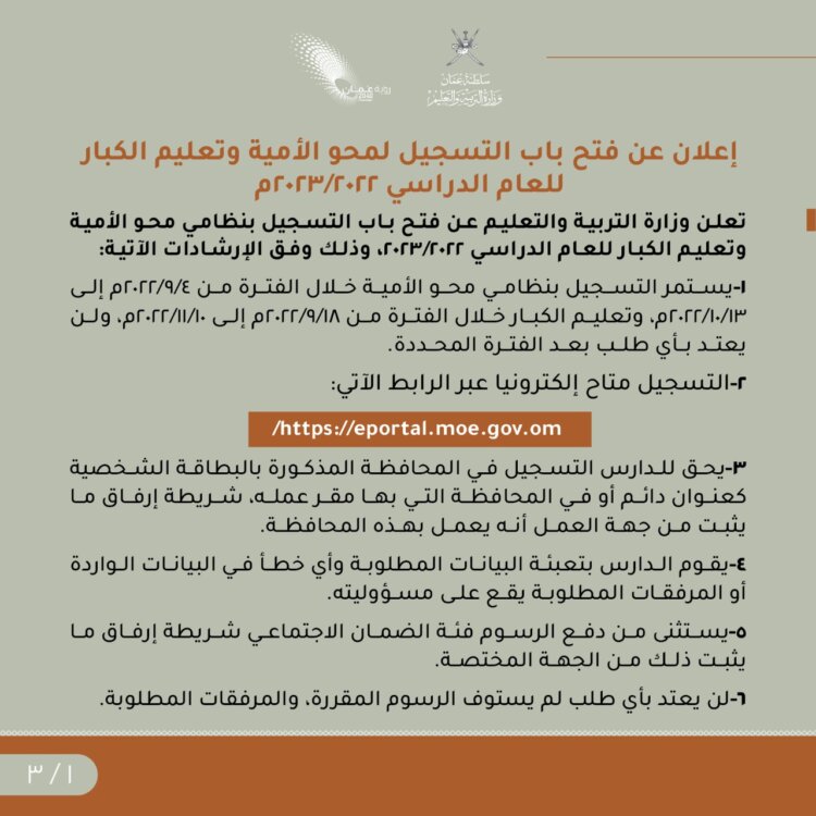 أعلنت وزارة التربية والتعليم للراغبين في التسجيل في نظام التعليم الكبار ومحو الامية للعام الدراسي 2023/2022م