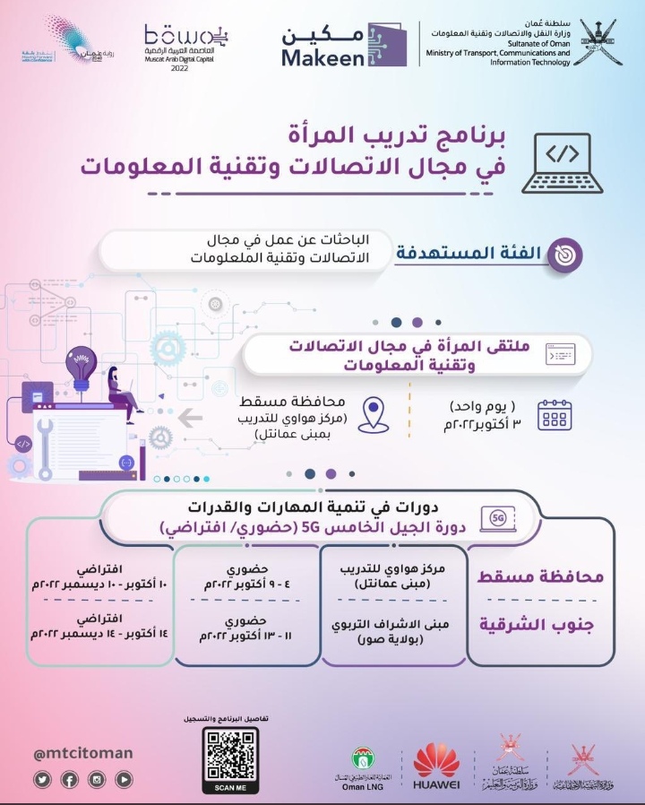 تعمل وزارة النقل والاتصالات وتقنية المعلومات بالتعاون بالتعاون مع المؤسسات الحكومية والخاصة على تنفيذ برنامج تدريبي تخصصي في مجال الاتصالات وتقنية المعلومات، حيث يتم إتاحة الفرصة لتطوير المعرفة وصقل القدرات والمهارات والحصول على الشهادات التخصصية، بهدف زيادة أعدد المرأة الحاصلة على الشهادات التخصصية واكسابها ميزة تنافسية في هذا القطاع.