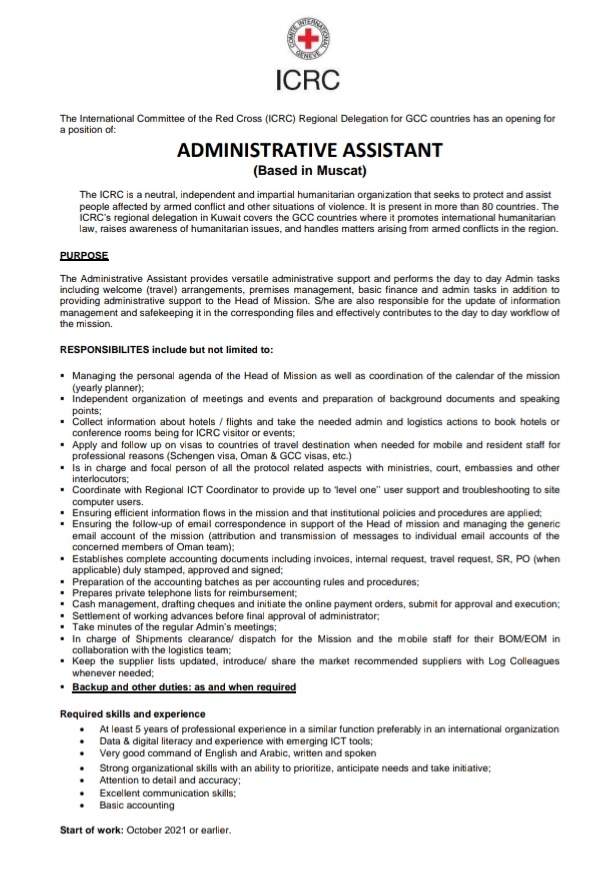 أعلنت اللجنة الدولية للصليب الأحمر في مسقط عن رغبتها بتعيين لديها مساعد إداري مع خبرة 5 سنوات.
