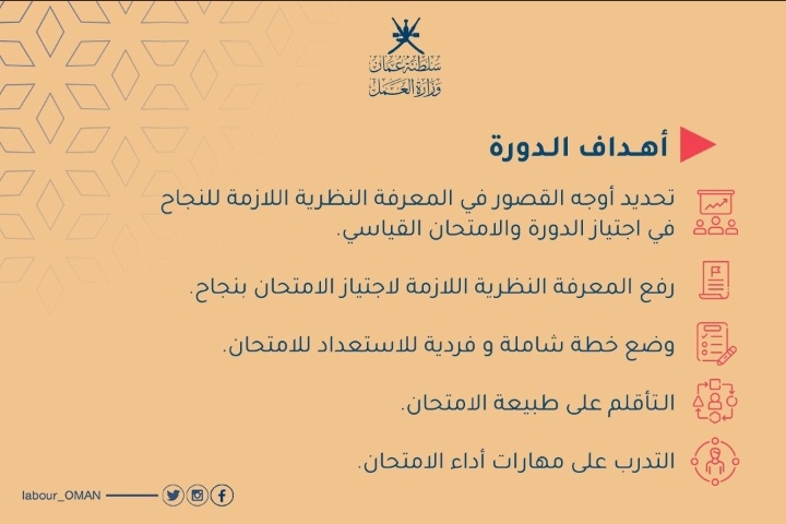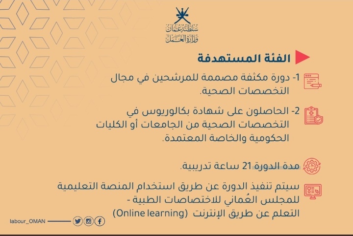 ‏سعيًا لرفد سوق العمل بمخرجات التخصصات الصحية؛ ‎وزارة العمل بالتعاون مع غرفة تجارة وصناعة عُمان والمجلس العُماني للاختصاصات الطبية و وزارة الصحة تتبنى مبادرةً لدعم (90) خريجًا من خريجي التخصصات الصحية لاجتياز اختبار التصنيف المهني في نسختها الأولى.