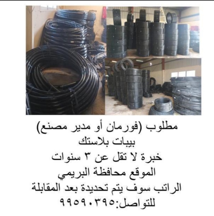 أعلنت شركة في البريمي عن رغبتها بتعيين فورمان أو مدير مصنع مع خبرة لا تقل عن 3 سنوات.