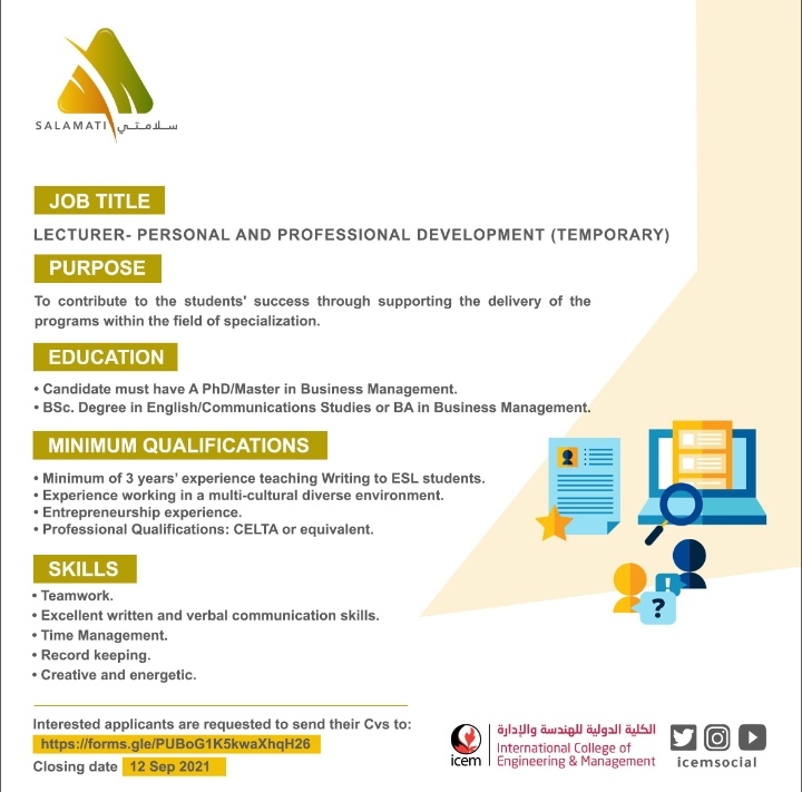أعلنت مجموعة سلامتي ممثلةً بالكلية الدولية للهندسة والإدارة عن توفّر وظيفة مؤقتة "محاضر تنمية المهارات الشخصية والمهنية". للتقديم اضغط هنا لتصفح المزيد من جديد الوظائف و التدريب بالسلطنة اضغط هنا