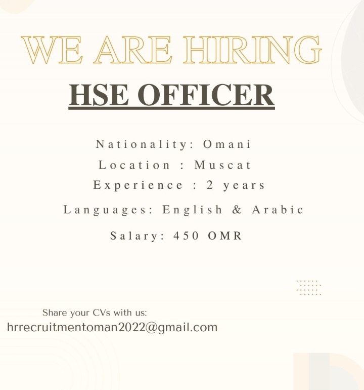 أعلنت شركة في مسقط عن رغبتها بتعيين لديها ضابط صحة وسلامة بيئية HSE Officer.