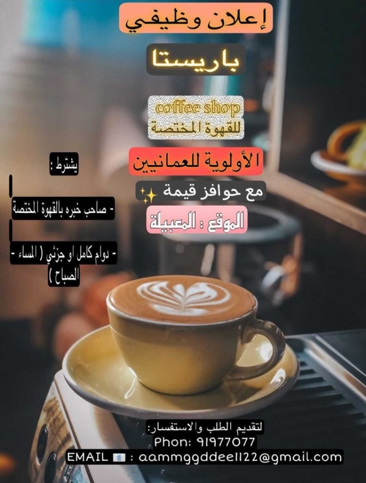 ‏وظيفة شاغرة للعمانيين في إحدى المقاهى المختصة بالقهوة.