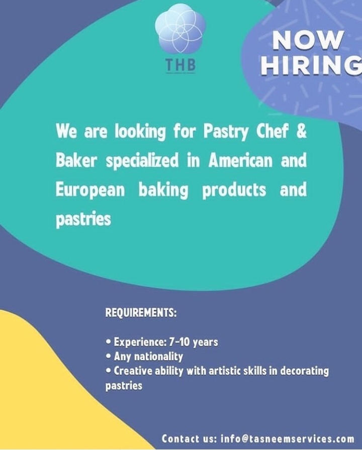 أعلنت شركة تسنيم للخدمات عن رغبتها بتعيين لديها أخصائي حلويات و معجنات مع خبرة 7 سنوات.