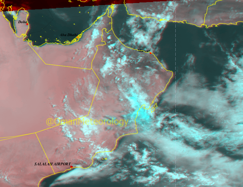 توضح آخر الصور الجوية تشكل السحب على جبال الحجر مع فرص لهطول أمطار متفرقة قد تكون رعدية احيانا بالاضافة الى تدفق السحب على معظم محافظات السلطنة وتكاثف السحب المنخفضة على أجزاء من سواحل وجبال محافظة ظفار.