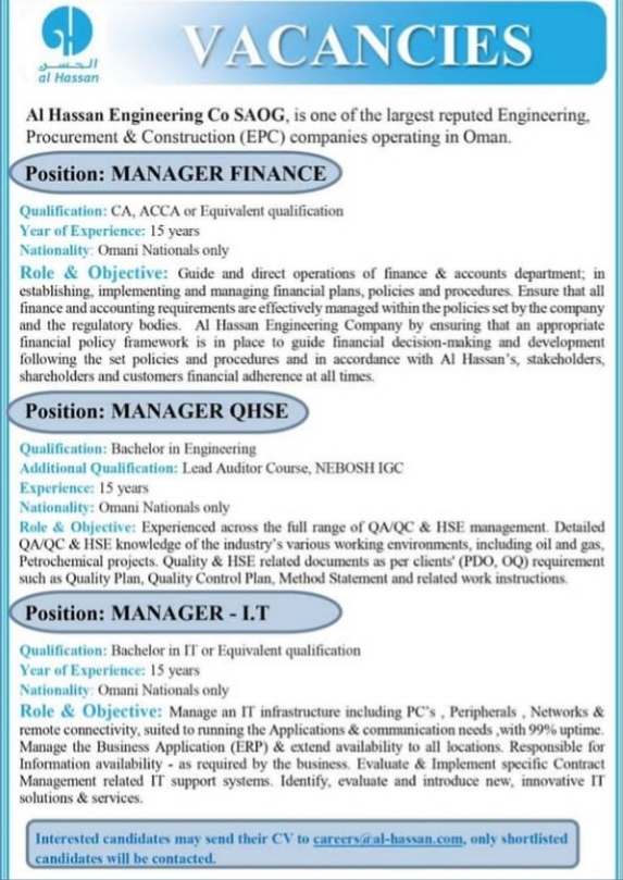 أعلنت شركة الحسن عن رغبتها بتعيين لديها :