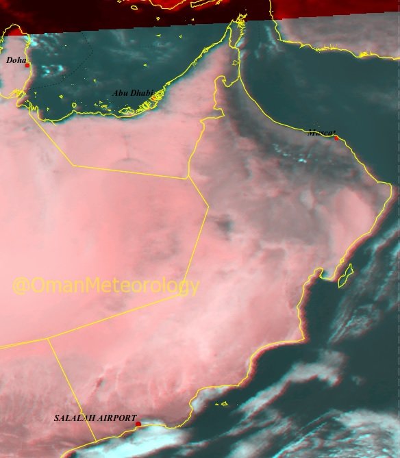 الصورة الجوية توضح بداية نشاط التكونات المحلية على جبال الحجر الأوسط مع فرص امتدادها لاحقا على بقية جبال الحجر والمناطق المجاورة وفرص لأمطار متفرقة تكون رعدية مصحوبة برياح نشطة لاحقا مع نشاط سحب الخريف على سواحل وجبال محافظة ظفار.