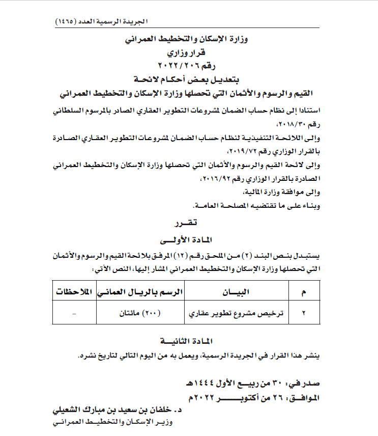 استنادا إلى نظام حساب الضمان لمشروعات التطوير العقاري الصادر بالمرسوم السلطاني رقم ۲۰۱۸/۳۰، وإلى اللائحة التنفيذية لنظـام حسـاب الضمان لمشروعات التطوير العقاري الصادرة بالقرار الوزاري رقم ۲۰۱۹/۷۲، وإلى لائحة القيم والرسوم والأثمان التي تحصلها وزارة الإسكان والتخطيط العمراني الصادرة بالقرار الوزاري رقم ٢٠١٦/٩٢، وإلى موافقة وزارة المالية، وبناء على ما تقتضيه المصلحـة العامـة.