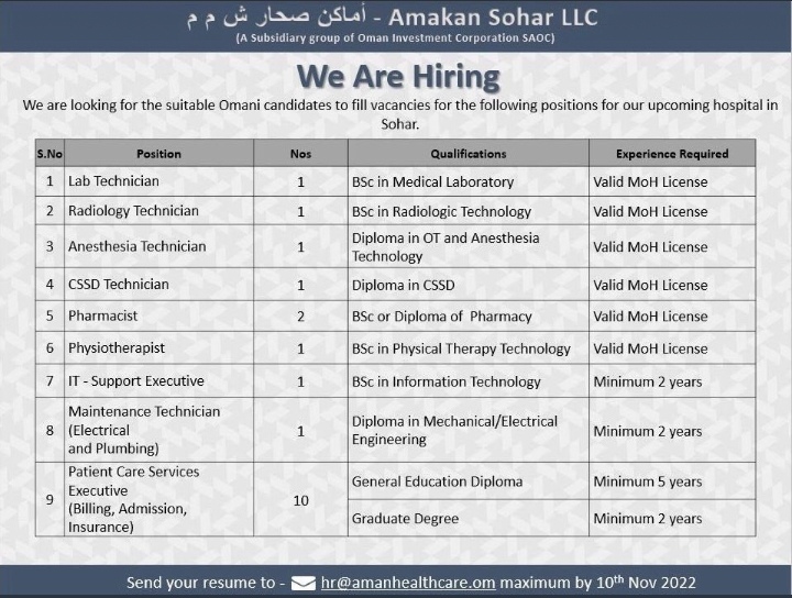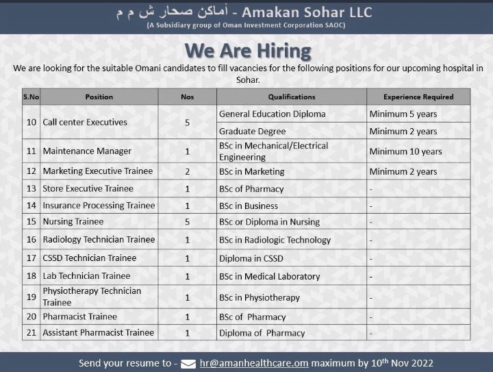 أعلنت شركة أماكن صحار عن رغبتها بتعيين لديها :