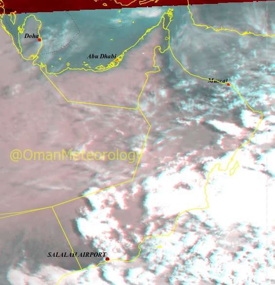 الصورة الجوية توضح تدفق السحب العالية والمتوسطة على الأجزاء الشمالية للسلطنة وانتشار السحب المنخفضة على على أجزاء من محافظات جنوب الشرقية والوسطى وظفار مع نشاط سحب الخريف على سواحل وجبال محافظة ظفار