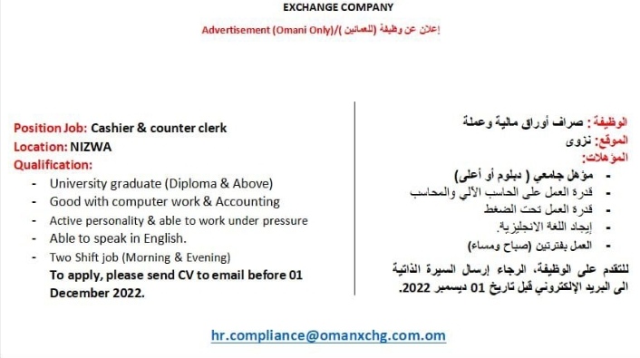 أعلنت شركة صرافة في نزوى عن رغبته بتعيين لديه صراف أوراق مالية وعملة
