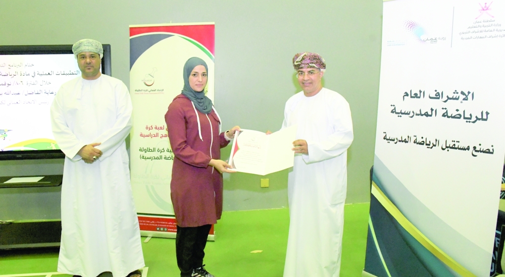 أقيمت اليوم بطولة مصغرة للمشاركين في البرنامج التدريبي “التطبيقات العملية في مادة الرياضة المدرسية في كرة الطاولة” والذي اختتم بمجمع السلطان قابوس الرياضي برعاية عبدالله بن محمد بامخالف رئيس الاتحاد العماني لكرة الطاولة، واستهدف البرنامج مشرفي الرياضة المدرسية بالمديريات التعليمية، إضافة إلى المختصين في الرياضة المدرسية بالمديريات العامة في ديوان عام وزارة التربية والتعليم البالغ عددهم 29 مشاركا، وبعد نهاية المنافسات تم تكريم المشاركين في البرنامج التدريبي.