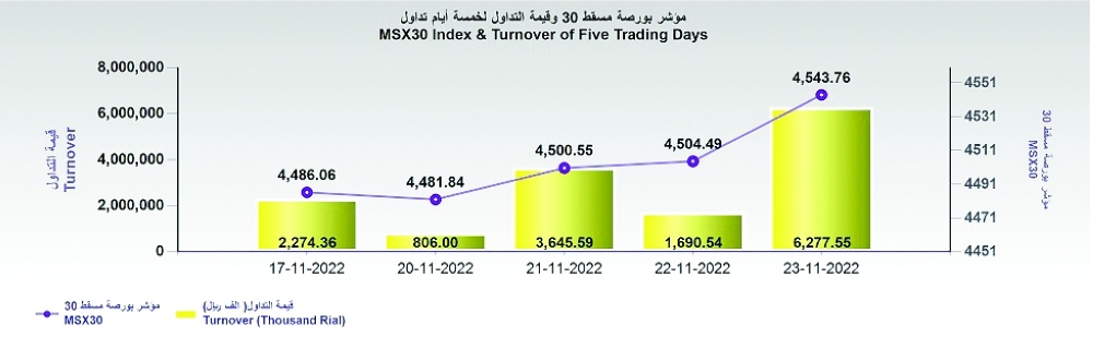 ووفقا لتداولات بورصة مسقط اليوم ارتفع المؤشر القياسي 39.3 نقطة بدعم من القطاع المالي، وبنسبة 0.872%، واستقر عند حاجز 4543.76 نقطة، وقفزت قيمة التداول إلى 6.278 مليون ريال عماني مرتفعة 271.3% مقارنة مع آخر جلسة تداول، وارتفعت القيمة السوقية 0.183% وبلغت ما يقارب 23.40 مليار ريال عماني.