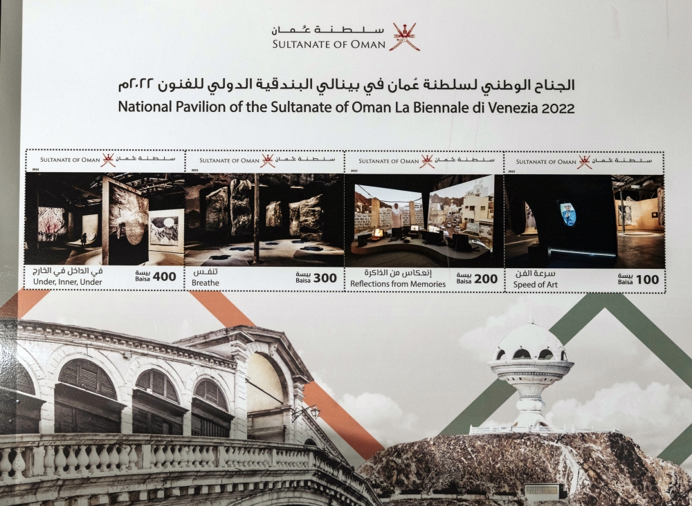 البندقية ـ العُمانية: اختتمت سلطنة عُمان مشاركتها الأولى في بينالي البندقية الدولي للفنون التاسع والخمسين – التي استمرت من (21 أبريل حتى 27) نوفمبر 2022 – بتدشين طوابع بريدية لجناحها الوطني. حضر حفل الختام سعادة السيد سعيد بن سلطان البوسعيدي وكيل وزارة الثقافة والرياضة والشباب للثقافة المفوّض العام للجناح، وصاحب السمو السيد نزار بن الجلندى آل سعيد سفير سلطنة عُمان المعتمد في الجمهورية الإيطالية، وممثّلون من الشركات الداعمة للجناح، وإدارة البينالي والشخصيات الثقافية في مدينة البندقية والفنانون، والقائمة على الجناح الدكتورة عائشة ستوبي. أطلق الحفل (4) طوابع بريدية تولّت شركة بريد عُمان إصدارها، وحملت في طياتها الأعمال الفنية المقدّمة في الجناح لكل من: أنور سونيا، والمغفور لها رياء الرواحية، وحسن مير، وبدور الريامية، وراديكا كيمجي.