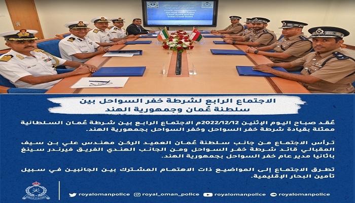 Muscat: The Royal Oman Police (ROP), represented by the Coast Guard Police Command and the Coast Guard of the Republic of India, held their fourth meeting on Monday.