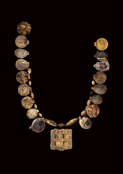 The 30 pendants and beads that once formed the elaborate necklace were made from Roman coins, gold, garnets, glass, and semiprecious stones. The centerpiece of the necklace, a rectangular pendant with a cross motif, was also among the artifacts that were discovered.