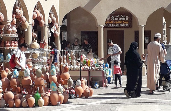Omani products were present in the entire market, which attracted tourists. Omani products included Omani Khanjar, bedouin jewellery, traditional wooden walking sticks, pottery, and clothes. In front of the Nizwa Fort, we saw some women cooking Omani food and tourists were busy eating, and their faces showed that they were enjoying it.