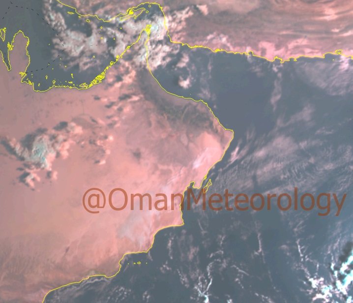 حاليا الصورة الجوية توضح انتشار وتدفق السحب على محافظة مسندم وأجزاء من شمال الباطنة والبريمي كما تتواجد السحب المنخفضة والضباب على محافظات جنوب الشرقية والوسطى وظفار
